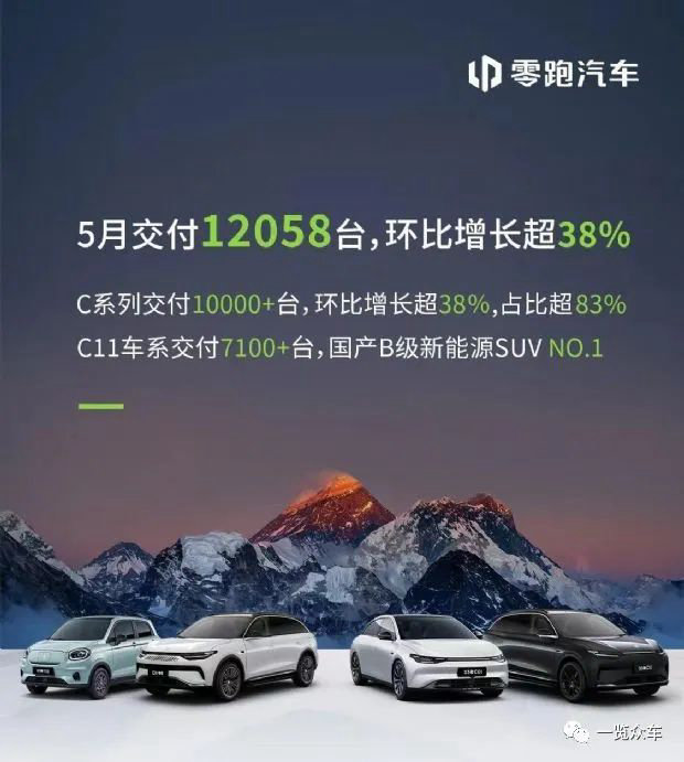 零跑汽车5月交付量达12058辆,环比增长超38%,今年首次突破万辆销量大关。与去年同期的10069辆相比,同比增长19.8%。其中,零跑C系列交付数量超过10000辆,占比超83%;零跑C11系列交付超7100辆。今年1-5月,零跑汽车累计交付31293辆新车,同比下跌23.2%。
