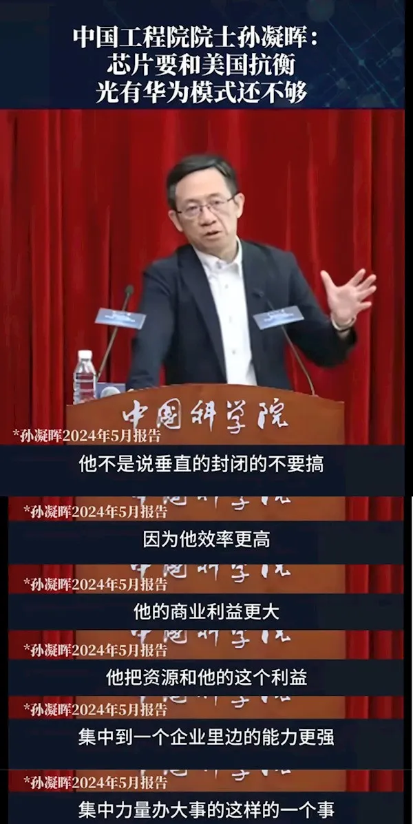 9月27日消息,近日中国工程院院士孙凝晖的发言引起了轩然大波,其公开称华为搞封闭垄断难对抗西方!“华为就是搞封闭,搞垄断,最好你们都别干,贡献给我就行了。你们都用我的芯片,你们都把技术给我,然后我搞一个端到端的,从这个制造到指令到软件到大模型,到这个应用,反正全都是我,智算中心到什么算力网全都是我,所以我想我们用这种中式的封闭、中式的垄断去对抗人家西式的封闭,西式的垄断啊,肯定是打不赢!”孙凝晖说道。孙凝晖院士指出,华为在技术发展上采取了一种封闭式、垄断性的模式。这种模式的核心是将技术和利益集中到一个企业内部,实现端到端的控制。华为的战术体系就是集中力量办大事,将技术和利益进行最大化发展。但这种模式的弊端在于,将整个技术的突破和产业链的命运押在一家企业上是风险巨大的。比如在华为被美国制裁期间,这种封闭式模式的脆弱性暴露无遗。华为的消费者业务受到了严重冲击,市场份额大幅下降,产品口碑也受到影响。尽管华为依靠通讯业务为其消费者业务输送资金,但上下游供应链的困境依然严峻。事实上,这是孙凝晖今年5月份的报告,不知道为什么在这个时候被重新提起,而看到这样的结论,不少网友也是纷纷吐槽。在网友看来,华为并没有搞垄断,华为的供应链是开放的,华为的手机里绝大部分都是采用的国内供应商的零部件,这都是肉眼可见的助力国产。此外,更多的网友也表示,鸿蒙系统也有开源的版本,华为在美国的持续打压下不仅没有趴下,反而还越来越强大了,证明了华为模式的成功。在孙凝晖院士看来,自己也并未否定华为模式的优势和作用,而是强调国内的技术发展和突破,仅仅依靠华为模式是不够的,还需要更开放的生态模式,需要更多的企业来发挥他的力量。